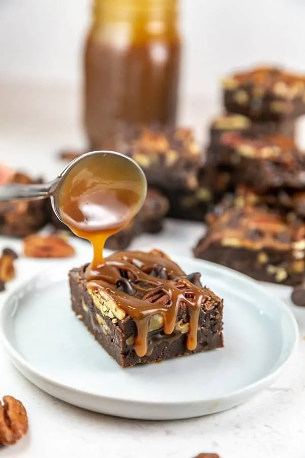 I’ve dipped a spoon into the jar more times than I care to admit, but I highly recommend you make a batch and save it for these pecan caramel turtle brownies. These brownies are, hands down, the best brownies I’ve ever made.