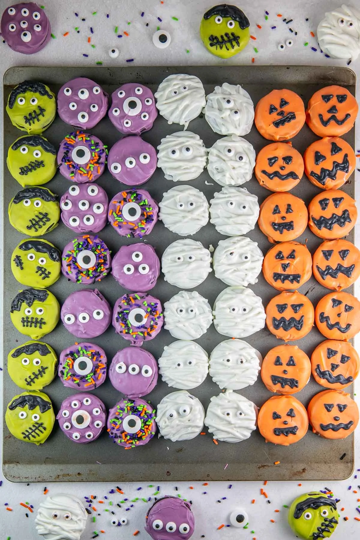 - Immediately add sprinkles or eyeballs to the surface of the Oreo before allowing the coating to harden.