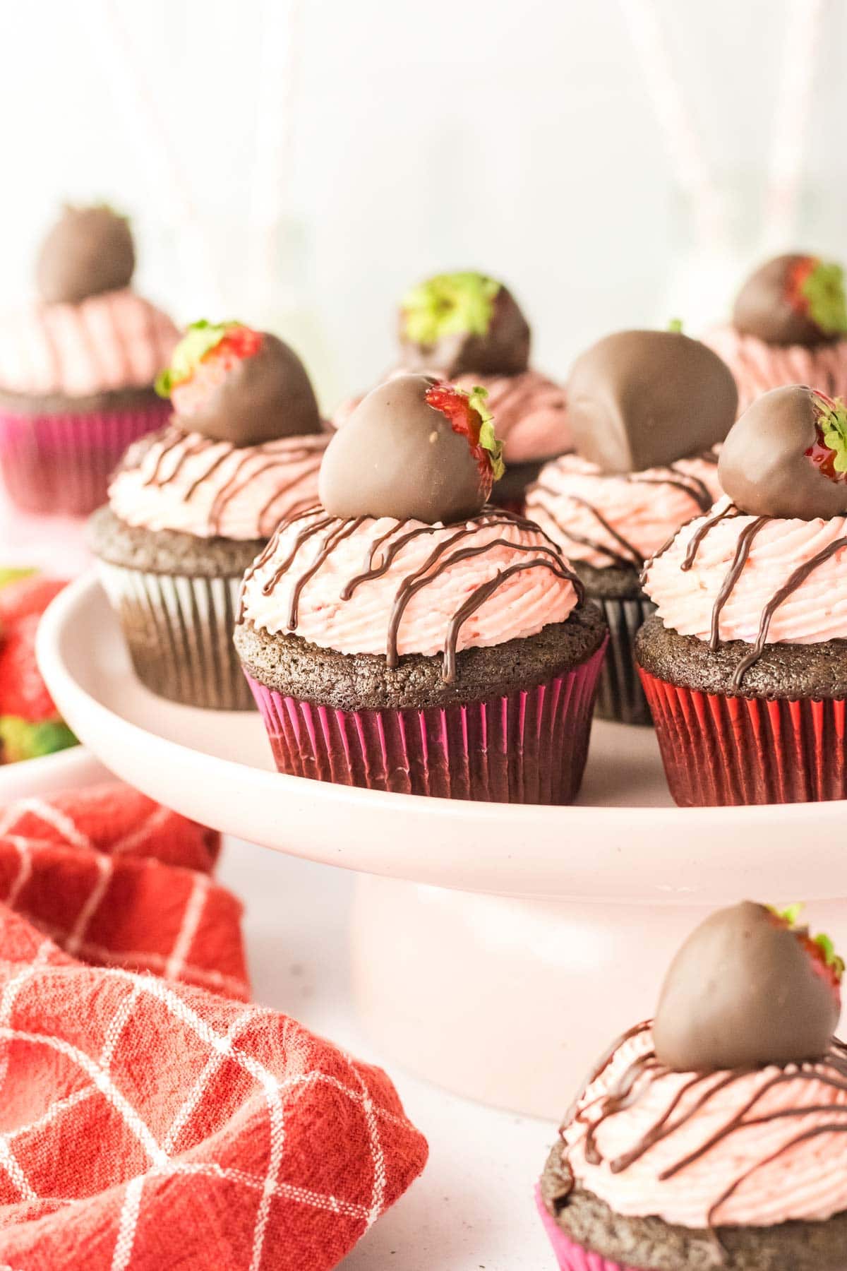 - Assemble the Cupcakes: Pipe or spread the strawberry buttercream onto the cooled cupcakes. Drizzle with the chocolate ganache and garnish with a chocolate-covered strawberry, if using. Serve immediately or store as directed.