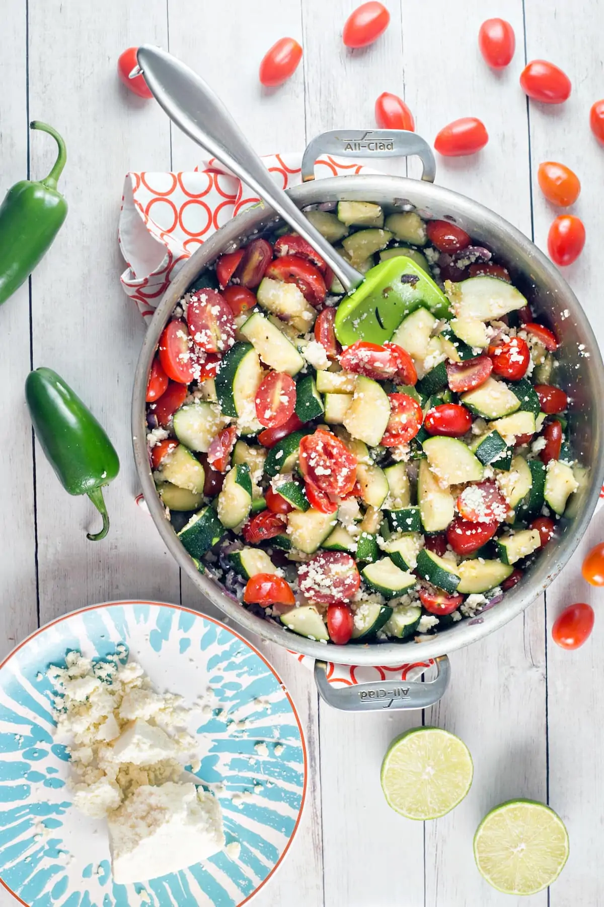 Summer zucchini and cherry tomatoes, red onion and garlic, fresh cilantro, jalapeños, and cotija cheese. It’s all my favorite Mexican flavors, paired with fresh zucchini. And the perfect way to get through your giant zucchini stash.