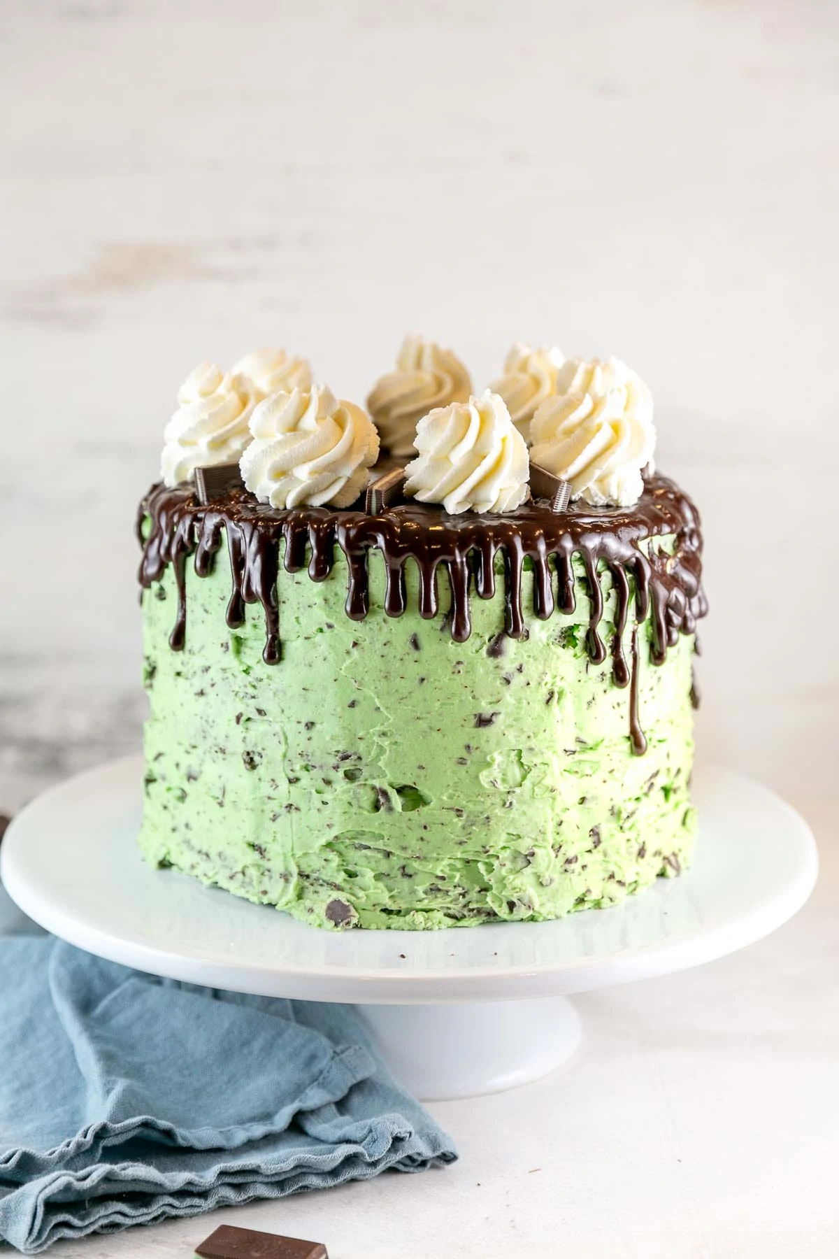 Whichever flavor cake you use, the minty buttercream frosting, full of chopped chocolate, layers of chopped Andes mints, dark chocolate ganache, and swirls of whipped cream make this cake a true winner!