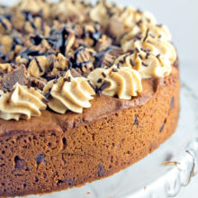 A giant peanut butter chocolate chip cookie cake, covered in peanut butter cups and whipped peanut butter ganache. This peanut butter cup cookie cake...