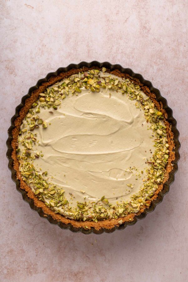 - Fill and Chill: Spread the filling into the cooled crust, smooth the top, and refrigerate at least 4 hours, preferably overnight. Top with chopped pistachio, whipped cream, or shaved white chocolate before serving.