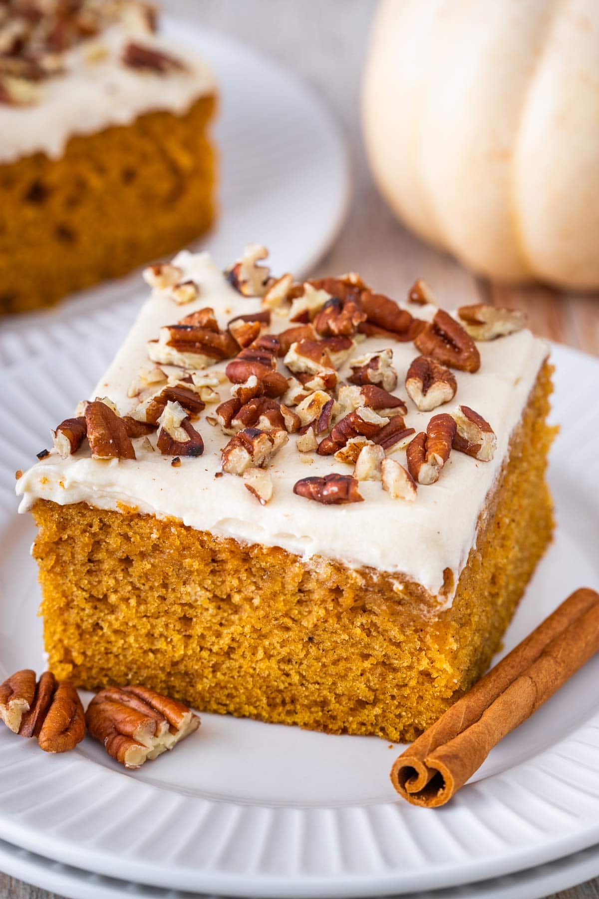 Perfectly spiced Pumpkin Sheet Cake topped with rich maple cream cheese frosting and a sprinkle of toasted pecans brings cozy flavors to every bite.