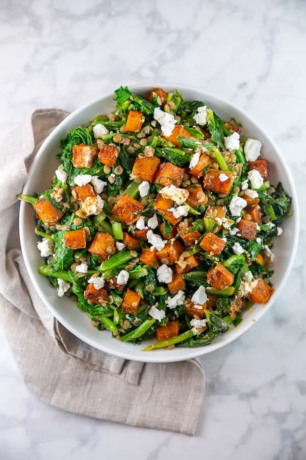 Roasted butternut squash, green lentils, and turnip greens combine into one nutritional superfood salad! Spicy Butternut Squash Salad is delicious warm or cold and perfect for an easy bowl dinner or served as a vegetarian and gluten free side for holiday celebrations.
